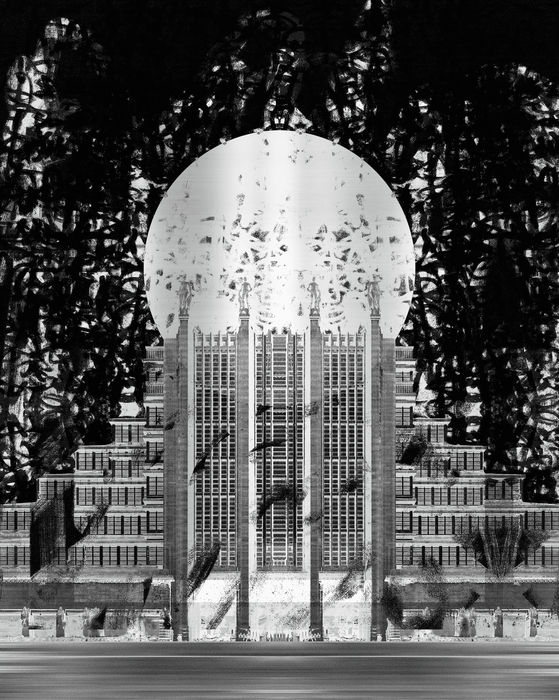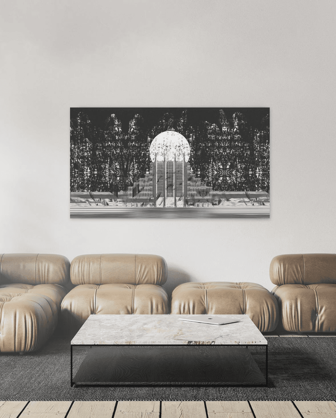 N°05 from the project “L’Affiche Brutaliste” This artwork presents a fragmented and deconstructed reinterpretation of Palais 5 in Brussels, a prominent exhibition hall within the Brussels Expo complex. Blending photography and painting, the image adopts a glitch-like aesthetic, where architectural elements seem to dissolve and reassemble through a dynamic interplay of lines, textures, and contrasts. The black-and-white graphic treatment heightens the sense of abstraction, evoking a distorted and experimental vision of the building. This reimagining highlights both the monumental character and the modernist roots of Palais 5, while pushing its form into a more conceptual and architectural expression. Mixed media print on brushed aluminum Dimensions : 160 x 90 cm Limited edition : 5 Pieces